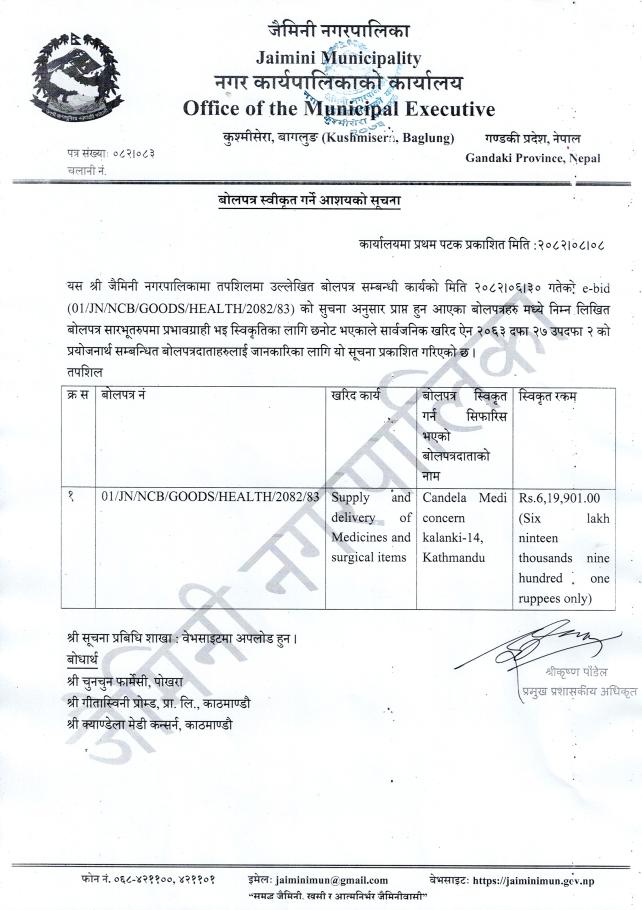 बोलपत्र स्वीकृत गर्ने आशयको सूचना।