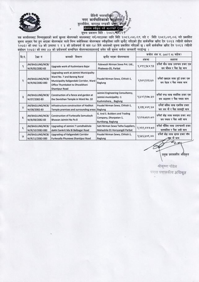 बोलपत्र स्वीकृत गर्ने आशयको सूचना।