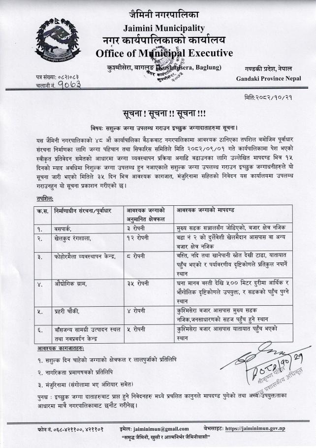 सशुल्क जग्गा उपलब्ध गराउन इच्छुक जग्गादाताहरूमा सूचना।