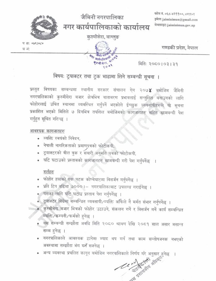ट्रयाक्टर तथआ ट्रक भाडामा लिने सम्बन्धी सूचना।