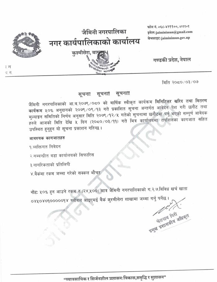 » मिनिटिलर खरिद तथा वितरण कार्यक्रममा छनौट भएका सम्पूर्ण आवेदक हरूलाई सूचाना।