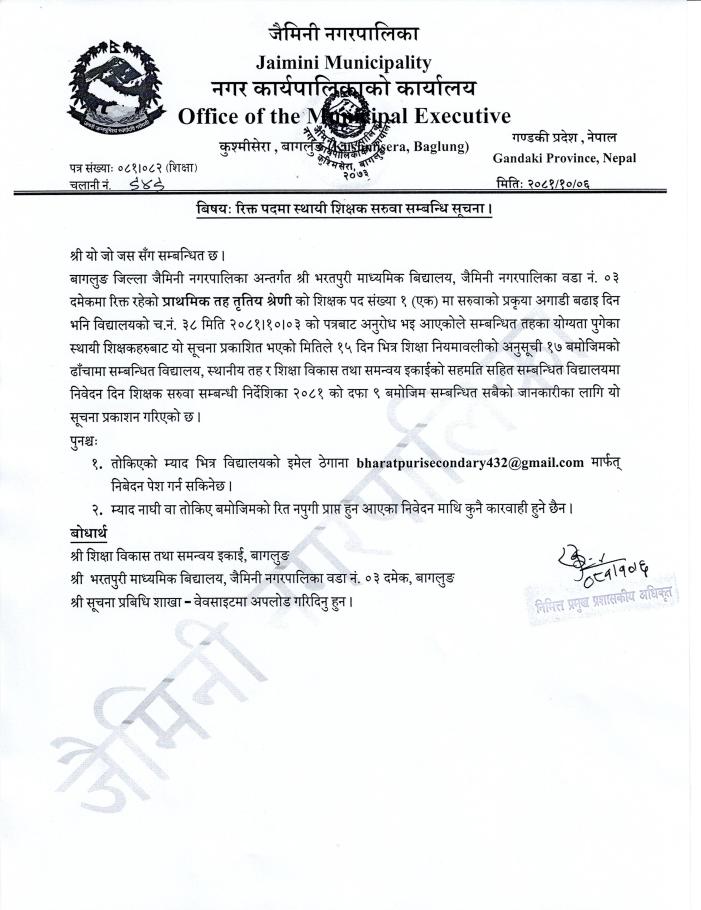 रिक्त पदमा स्थायी शिक्षक सरुवा सम्बन्धी सूचना।